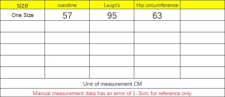 waist 57 maximum stretch 100cm, hip 63 maximum stretch 120cm, length 95 maximum stretch 115cm, recommended weight 40-80kg,